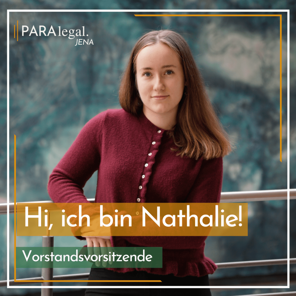 Nathalie Hamann ist 23 Jahre alt und gerade im 9. Semester. Sie ist nun als Vorstandsvorsitzende gemeinsam mit JJ für die Gesamtorganisation im Verein zuständig. Neben ihrem Studium engagiert sich Nathalie bei einem Unihockey-Verein in Berlin und liest in ihrer Freizeit gerne.